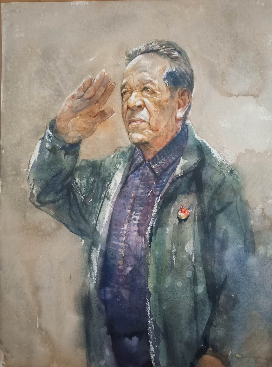 “作为一名高校美术教师,我要用画笔记录下老兵志愿者们抗击疫情的动人瞬间,为他们的感人形象和他们身上体现出的大爱精神讴歌、画像。”王伟业是公司九三学社社员,从教30多年来始终在画笔上坚守初心和使命,在创作中关照生命和现实。2012年以来,王伟业老师坚持为老兵画像,笔下已经诞生了40多幅抗战老兵画像。交流之后,王伟业老师在现场速写基础上,为杨希岗创作了水彩人像作品,并纳入他的老兵系列画作。