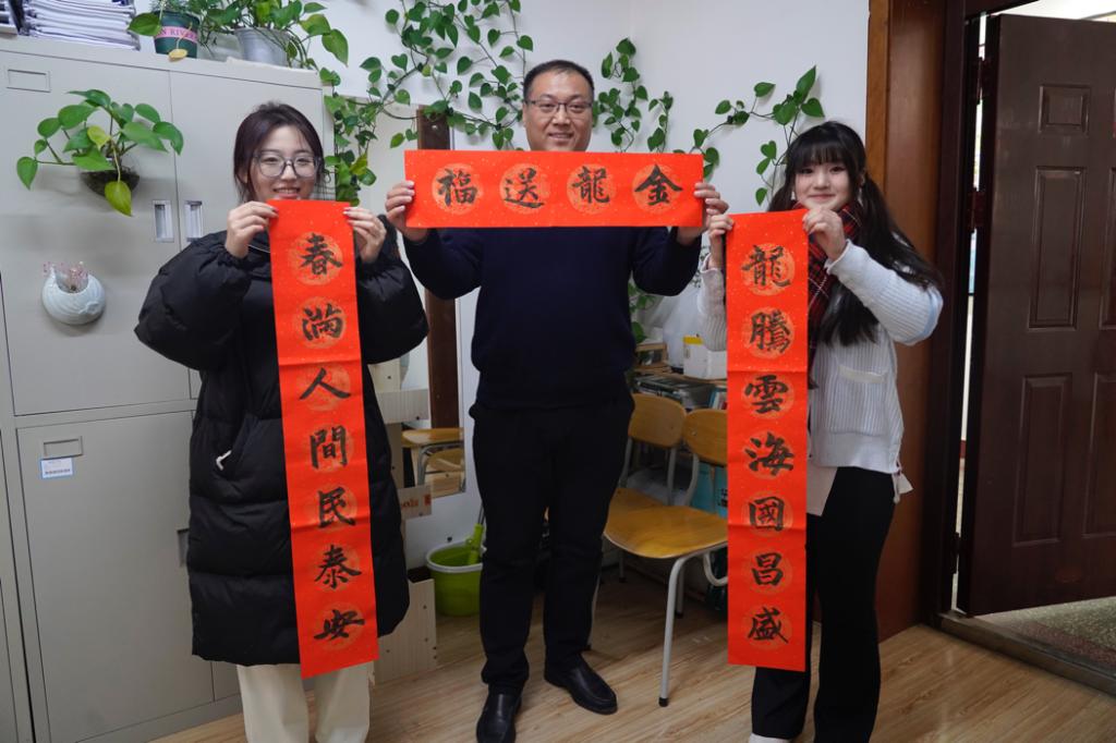 随后,同学们还将充满新春祝福的作品送给教研室各位老师,以及为校园安全和员工宿舍默默付出的保安大叔和宿管阿姨们。在这个寒冬,让他们提前感受到春节温暖祥和的节日气氛。宿管阿姨说“贴上喜庆的春联,过一个欢乐年”。送祝福到校园,不只是送的祝福,更是寄托着同学们对新年的憧憬和向往,传递着迎春纳福、期盼幸福生活的美好愿望。
