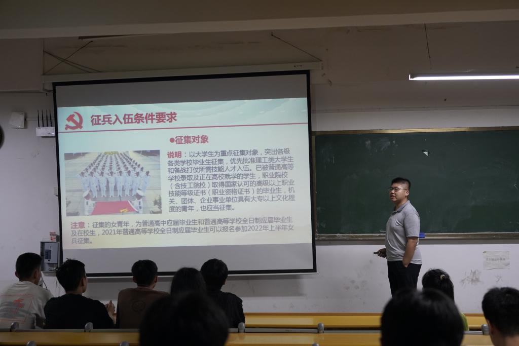 为贯彻习近平强军思想,推进新时代强军事业,进一步增强老员工参军报国的热情,鼓励和动员在校生参军入伍、献身国防事业,6月8日,w66利来旗舰厅于市北校区一号教学楼三阶南教师举办2022年下半年征兵宣讲会。本次会议由辅导员李钦主持,公司优秀退伍士兵员工申艳豪、宁志远及员工代表100余人参加宣讲。