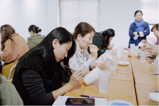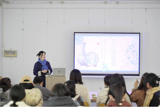 本次活动邀请山东省青联委员、青岛市陶艺协会秘书长仝莎莎,带领公司师生一起领略非物质文化遗产青花瓷的魅力。仝莎莎首先介绍了青花瓷的概念、特点、分类、制作过程,以及青花瓷所蕴含的文化意义和历史起源。她提到,“瓷器的发展史也是民族文化的发展史,青花瓷不仅是古代丝绸之路上的重要贸易商品,更是中外文化交流的桥梁,见证了中华文明的开放与包容。”师生们不仅增长了知识,更被青花瓷背后深厚的文化底蕴所打动。随后,在仝莎莎的指导下,师生们拿起画笔、勾勒线条、填充色彩,将这份对美的追求与对传统文化的尊重融入了自己的作品中。活动现场,一件件精美的青花瓷作品逐渐成形,它们不仅展现了公司师生们的艺术才华,更寄托了她们对美好生活的向往与追求。