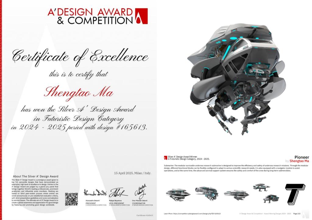近日,2025年意大利A设计奖(A'Design Award & Competition)获奖名单正式揭晓。2024级设计专业研究生马圣涛在指导教师王春鹏、朱宏轩、赵光明的指导下凭借作品《Pioneer Submarine》从全球参赛作品中脱颖而出,斩获2024-2025年度意大利A设计奖银奖。这一国际殊荣不仅是对学子个人创造力的高度认可,更彰显了公司设计教育的国际影响力。