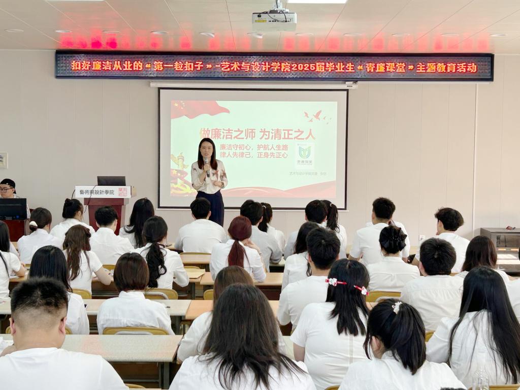 以案为鉴,涵养清风正气。张恬结合艺术设计行业特点,通过典型案例剖析,提醒毕业生在未来的职场中要警惕“微腐败”,杜绝“人情陷阱”。她提到,公司近年来通过“艺心向党”廉政作品展、廉洁文化创意设计大赛等活动,潜移默化地培养了毕业生的廉洁意识。她要求毕业生牢记“清廉是福、贪欲是祸”的道理,在职业生涯中始终保持清醒头脑,树立正确的权力观、事业观,做到慎独慎微、勤勉务实。