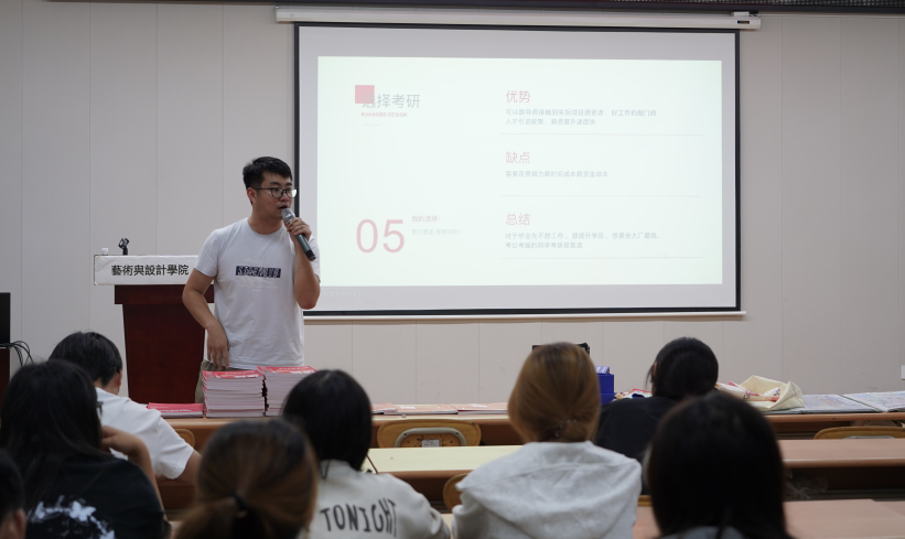 从“古韵今风:传统文化与现代设计的和谐共生”,到“数字浪潮:媒体艺术的创新实践路径”,再到“责任与美:设计伦理在社会中的角色与担当”,各位嘉宾不仅展示了各自的研究成果,还通过生动的案例和独到的见解,激发了师生们对创新实践无限可能的思考。现场互动热烈,师生们积极举手提问,交流观点,共同探讨创新创业的机遇与挑战。同时,在分享中,学长学姐们也从自己的经历出发,提醒本科的学弟学妹们,竞赛活动要面临很多困难和挑战,要面临一次次的打翻重来,但一定要保持坚定的信念和乐观的态度,因为每一次的坚持与努力,都是通往梦想彼岸的宝贵船票。