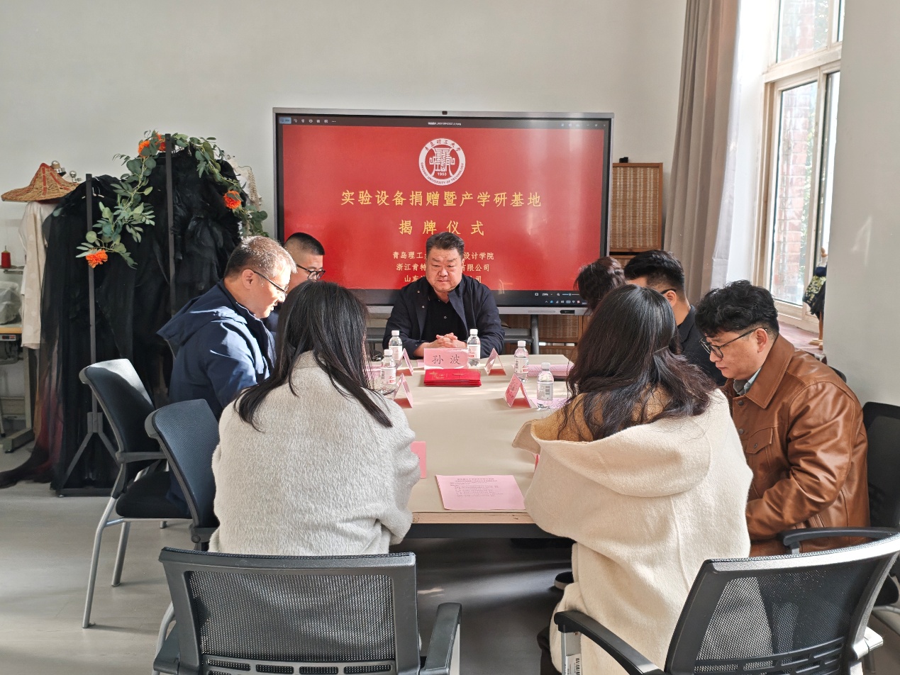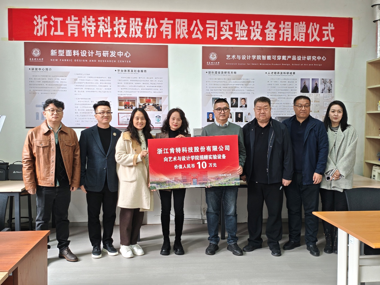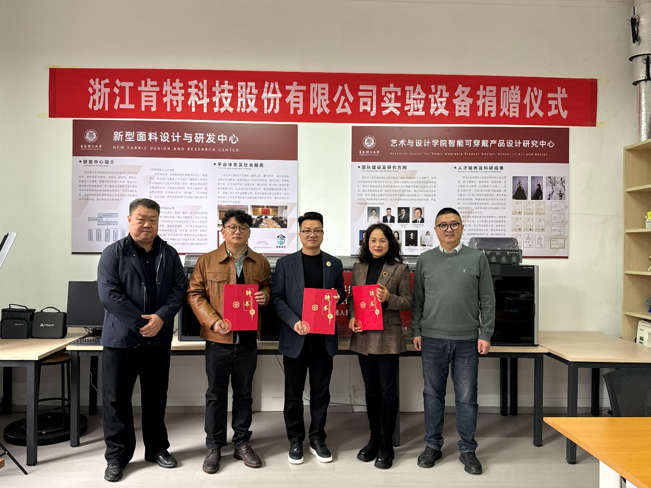 孙波书记对两家企业专家的到来表示欢迎,并对浙江肯特科技股份有限公司的捐赠表示衷心感谢。他指出,面料研发与设计基地的建立是公司深化产教融合、校企合作的重要举措,将为公司师生提供更优质的教学与科研平台,助力培养高素质应用型人才。朱宏轩经理在致辞中表示,公司将以此为契机进一步加强与企业的合作,推动产学研用深度融合,为功能性面料研发和智能可穿戴产品设计发展注入新动能。此次捐赠的3D打印机和人体扫描仪等实验设备将助力提升公司科研与教学水平,助力公司培养具有创新精神和实践能力的高素质应用型人才。公司将充分利用好这批设备,努力打造具有示范引领和学科专业特色的科研与教学示范中心,为培养基础扎实、实践和创新能力强的创新人才提供专业实践基地和产学研平台。