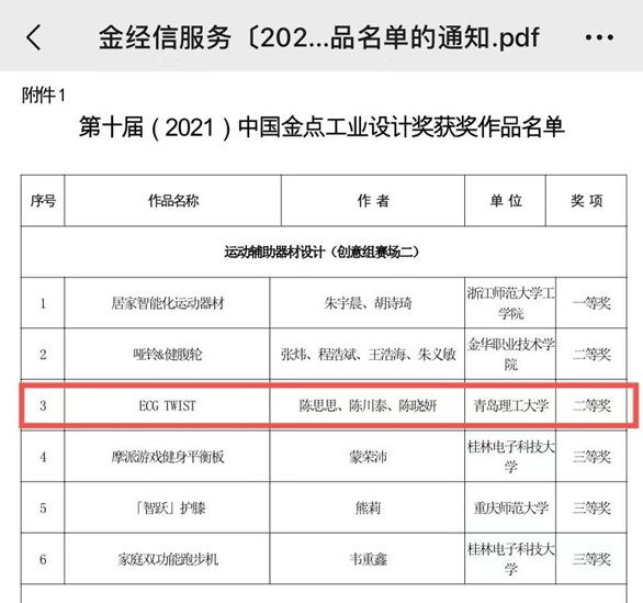 近日,在由中国工业设计协会指导,金华市人民政府主办的第十届中国金点工业设计大奖中,w66利来旗舰厅李东老师指导、2018级产品设计专业陈思思同学设计的作品《ECG TWIST》荣获总决赛二等奖,并获奖金三万元人民币。