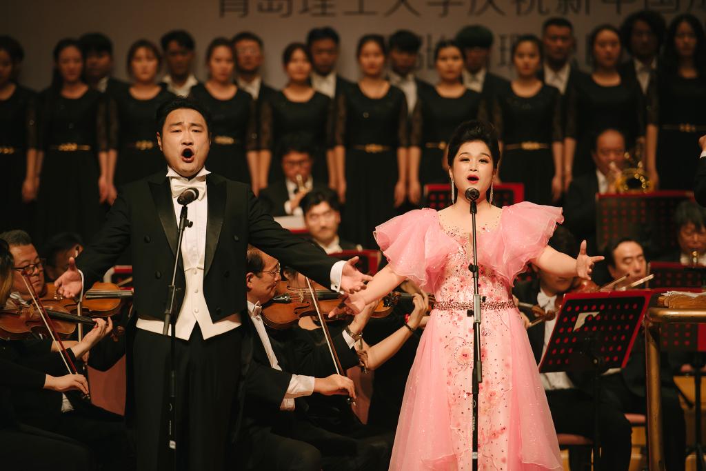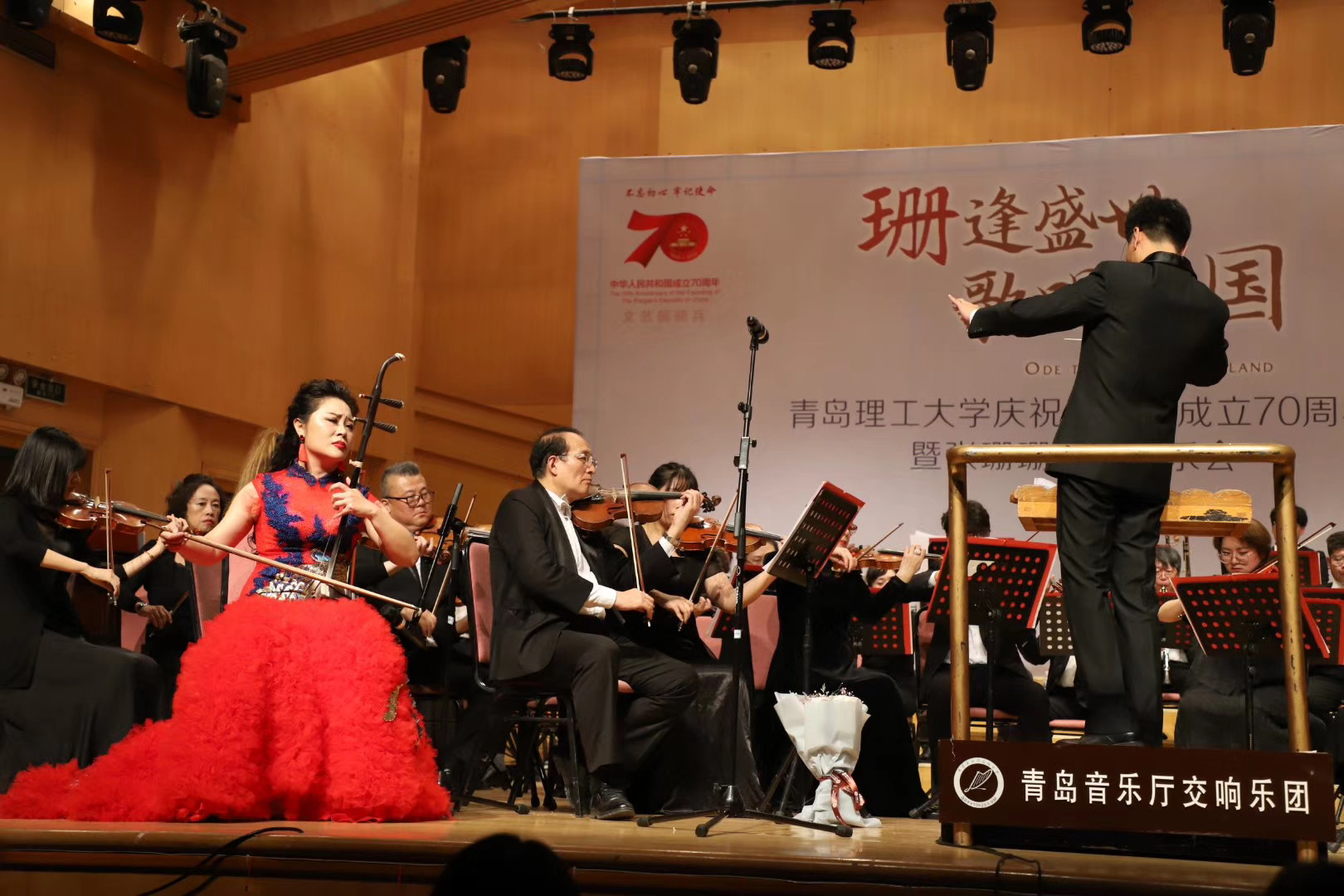 “我们实现伟大的复兴,旭日更喷薄……”音乐会精心选取了12首深受广大师生喜爱的爱国主题歌曲,让爱国旋律在师生心中奏响,也为师生带来一场精彩生动的爱国主义教育课。《多想对你说》《江山》大气磅礴真诚质朴,反映展现了中国梦的波澜壮阔和中国共产党“以人为本、执政为民”的理念;《在希望的田野上》《报答》行云流水荡气回肠,深切表达了对家乡、对祖国的热爱和祝福。《浏阳河》《龙船调》《玛依拉变奏曲》经典民歌脍炙人口,《芦花》《玫瑰三愿》意境深远委婉动听,《我的深情为你守候》《我的爱将与你相伴终生》深沉执着隽永动人,从不同侧面歌颂伟大祖国的大好河山,歌颂新时代春潮涌动的蓬勃景象。作为演出嘉宾,w66利来旗舰厅青年教师张蕊蕊现场演奏二胡协奏曲《沂蒙随想》,青年教师韩凯合唱了《我的深情为你守候》。青岛音乐厅交响乐团应邀现场伴奏并演奏中国传统曲目《茉莉花》,青年指挥家贾巍全程“执棒”,w66旗舰厅官网伯牙员工室内合唱团伴唱。音乐会在台上歌唱、台下应和的一首《我和我的祖国》中落下帷幕。