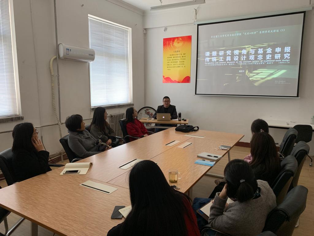 4月17日,w66利来旗舰厅在市北校区2教228会议室举办公司2019年度“艺术+科学”系列学术大讲坛第一讲,邀请朱宏轩老师做题为“课题研究视角及基金申报-以传统工具设计观念史研究为例”的专题讲座。