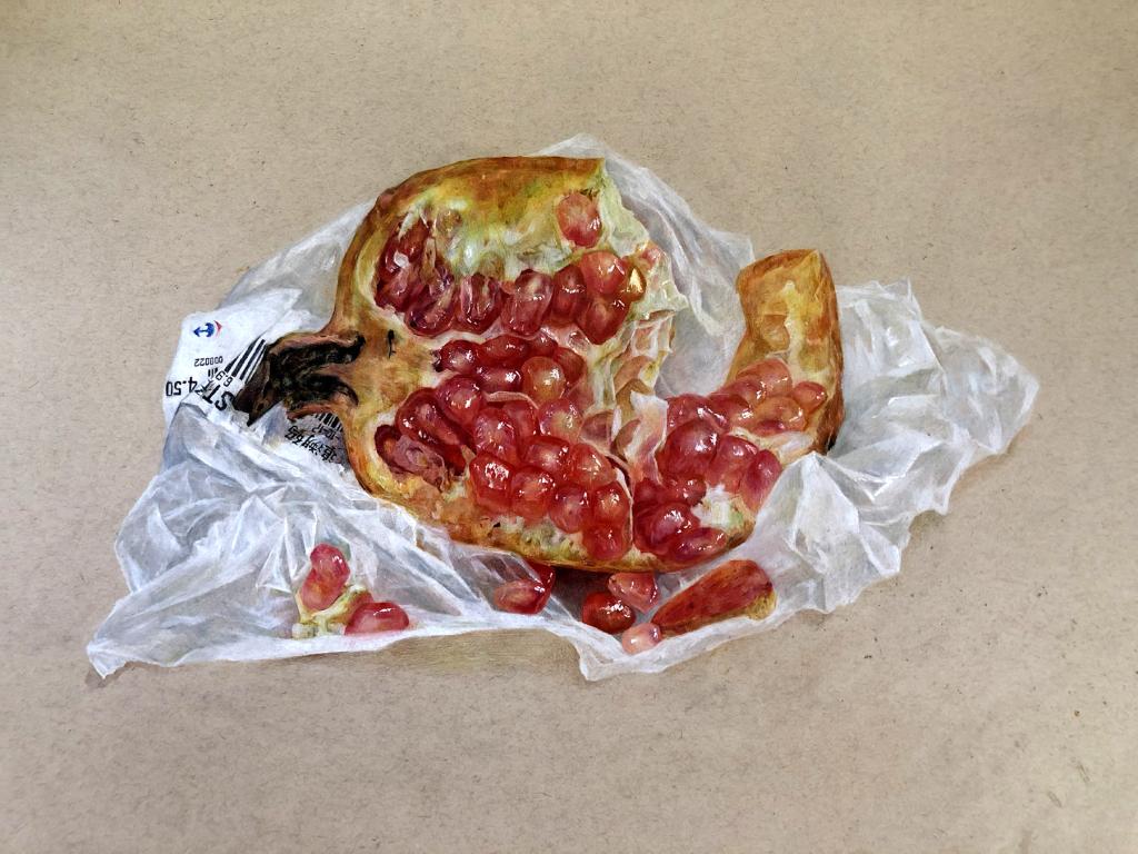 切开的菠萝、罐装腌蒜、吃了一半的石榴、真空包装的新鲜尾骨……一幅幅细致入微、栩栩如生的素描作品,把生活中常见的美食以绘画的形式呈现在大家面前,撩拨着师生的味蕾,令人回味无穷。12月19日-22日,2018级环境设计专业精微素描展在市北校区2号教学楼一楼开展。党总支书记、经理孙波及班子其他成员与师生一起参观了本次展览。