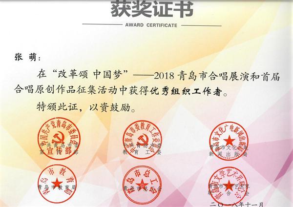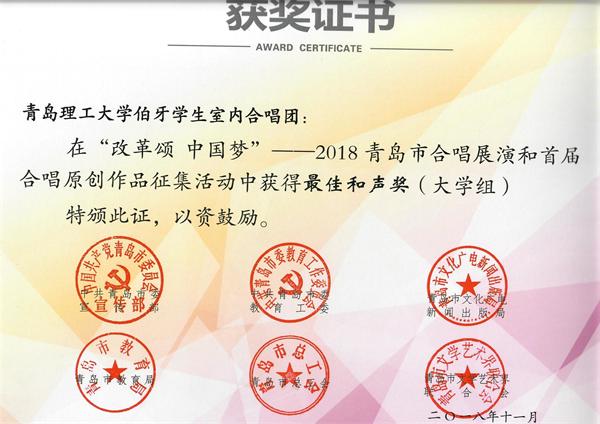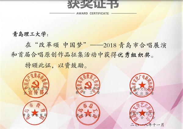 12月25日,“改革颂,中国梦”2018青岛市合唱展演成绩揭晓,w66旗舰厅官网伯牙员工室内合唱团获得最佳和声奖,公司获得优秀组织奖,w66利来旗舰厅张萌老师获得优秀组织工作者奖。