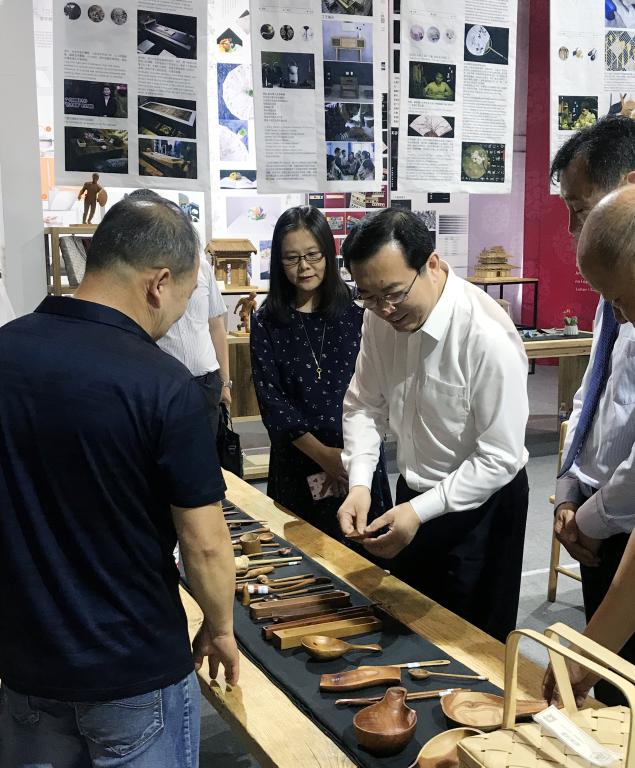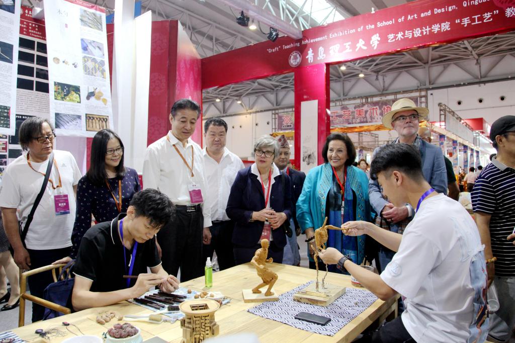 世界手工艺理事会主席罗茜·格林丽丝,亚太地区主席嘎达,副主席凯文·穆雷,青岛市委宣传部副部长、青岛市文广新局局长李明,青岛市工艺美术协会理事长满善良等中外工艺美术专家和领导参观了公司展区,观看了公司师生对手工木作、折扇、藤编、泥塑及核雕等的现场演示,对公司教学工作和师生作品表示赞许。