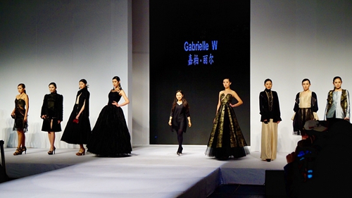 而27日, 在2015中国(青岛)国际时装周“新锐设计师”专场发布会中,王馨雨老师携其独立女装品牌“Gabrielle W (嘉柏•丽尔)”应邀参加了此次时装周的“新锐”发布。其品牌发布会以2015/16秋冬女装为趋势,以“the star”为主题, 选用黑色搭配金色、银色来与主题理念相呼应,对面料进行刷金、复合亮片、金属拉丝处理,同时搭配亮钻、珠片、撕黑尾来体现丰富的肌理效果。