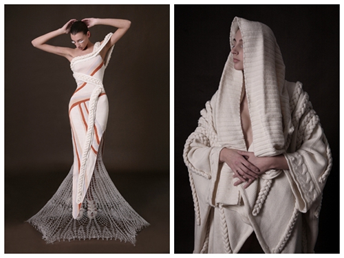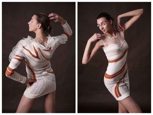 王馨雨老师此次参赛作品以“光圈”命名,灵感来源于《时间简史》中提到的生命与宇宙间的点、线、面的关系,以线,即宇宙光圈为出发点进行的设计。面料采用电脑针织提花工艺以及水晶线和珍珠来突出光圈主题。色调以木星光圈色系为基础,表现生命的轨迹和宇宙的无限。